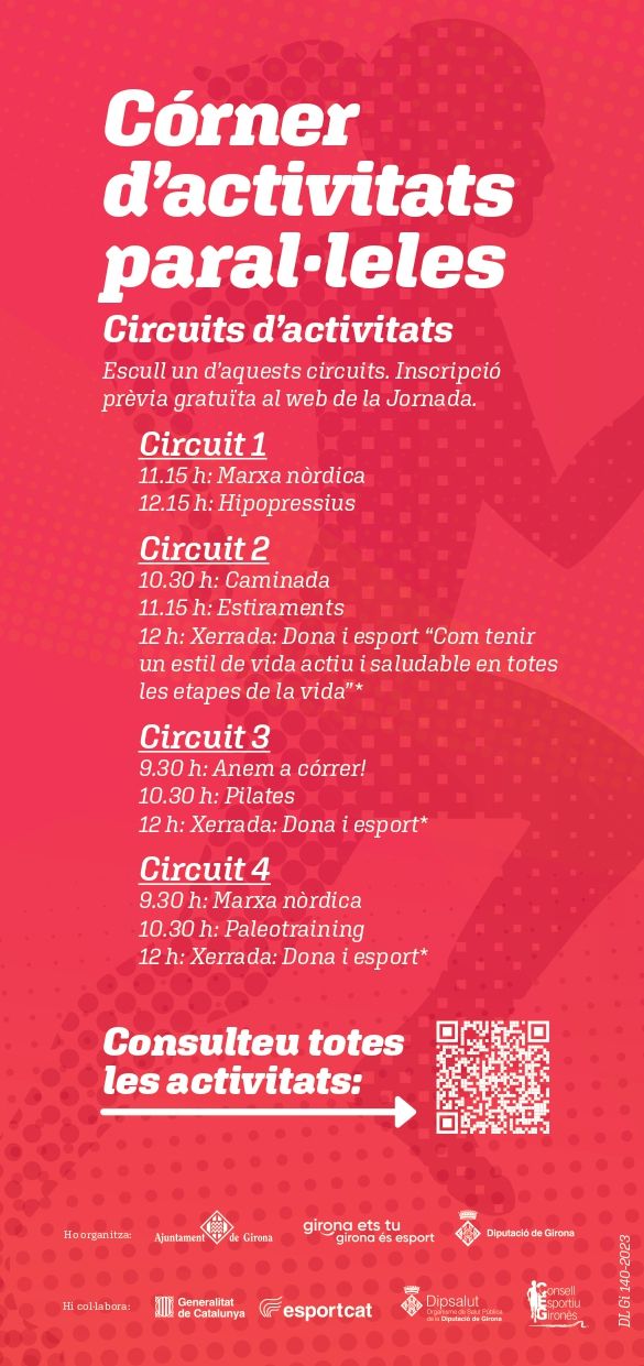 La Jornada de l'Esport Femení se celebrarà a la llera del riu Onyar i a les places de Catalunya, Salvador Espriu i Calvet i Rubalcaba de la ciutat de Girona. S'hi duran a terme activitats d'iniciació a diferents disciplines esportives, exhibicions, torneigs i entrenaments oberts. Tot plegat per fomentar que dones de totes les edats provin esports diferents i s'animin a incorporar o a recuperar la pràctica d'activitat física regular.