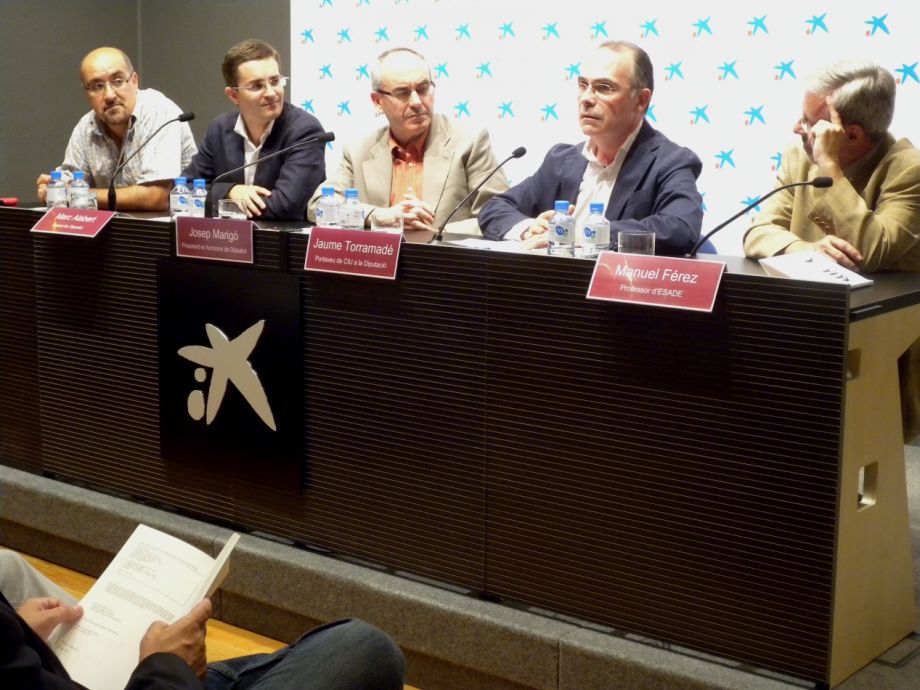 Imatge: acte de presentació del llibre (d’esquerra a dreta: Ramon Brugada, Marc Alabert, Josep Marigó, Jaume Torramadé i Manuel Férez).