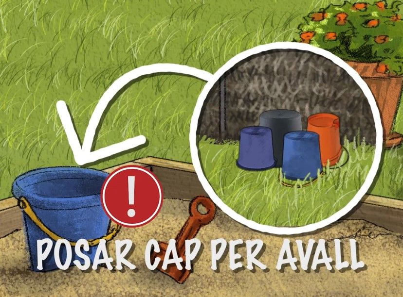 **Cal BUSCAR, BUIDAR I SOBRETOT CAPGIRAR tots aquells objectes que ens hagin quedat plens d'aigua: galledes, carretons, bidons, lones de plàstic...