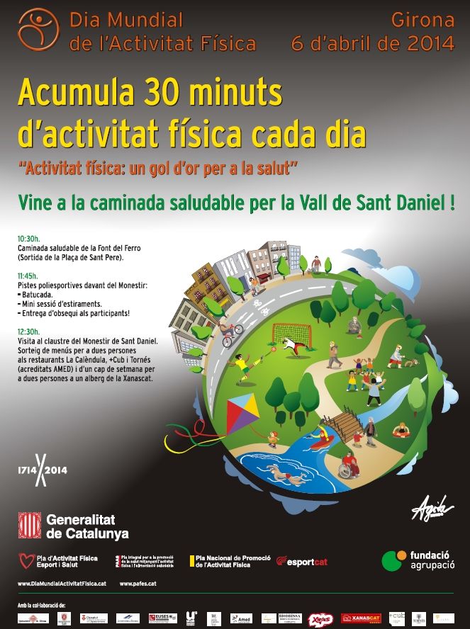 Diumenge 6 d’abril se celebra el Dia Mundial de l'Activitat Física. Amb aquesta iniciativa es vol promoure una vida activa com a element clau per a la salut i el benestar. El Dia Mundial té com a lema “Acumuleu 30 minuts d’activitat física moderada cada dia!”. Segons l’Organització Mundial de la Salut (OMS), mitja hora diària d’activitat moderada - com pot ser caminar, ballar o anar amb bicicleta- és suficient per notar beneficis en la nostra salut.