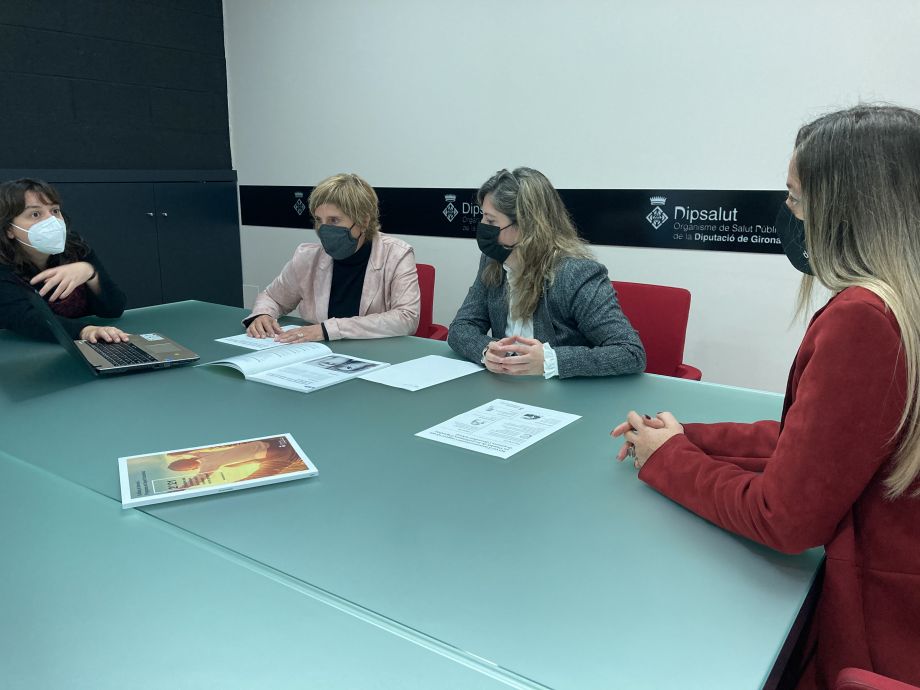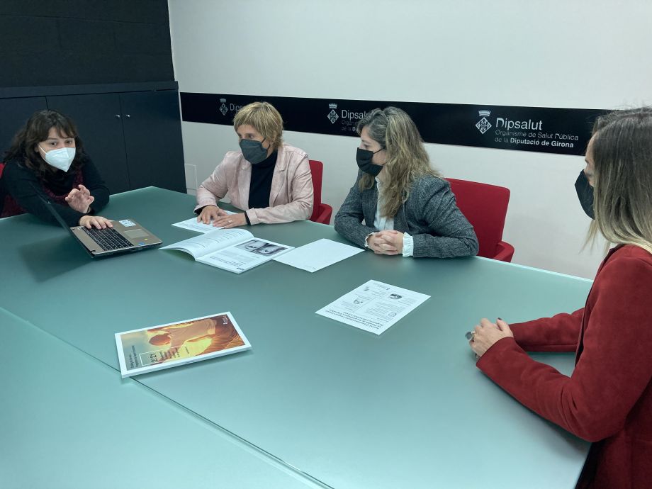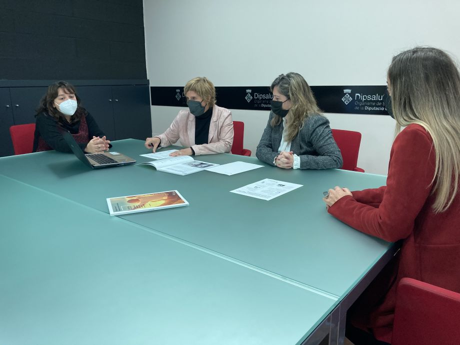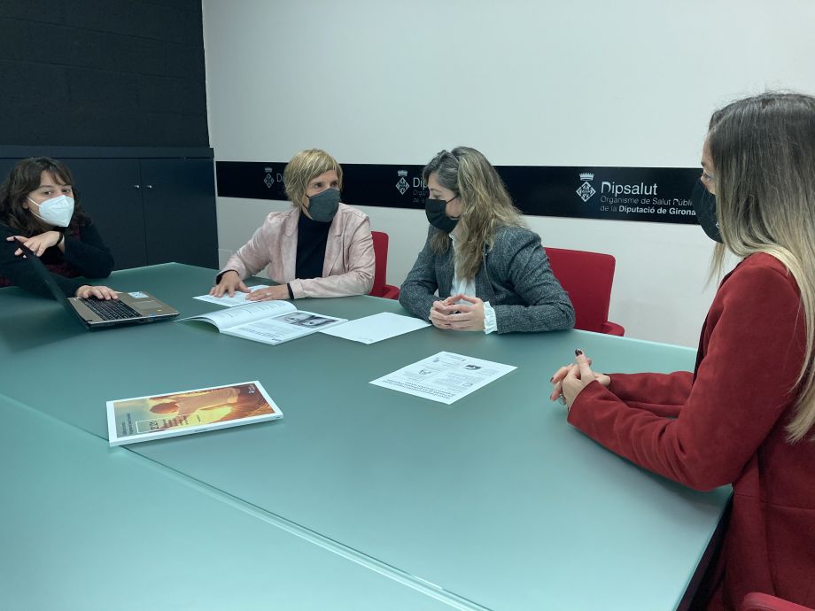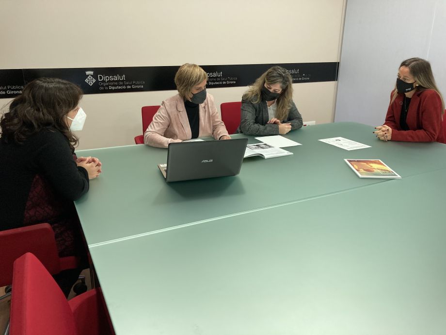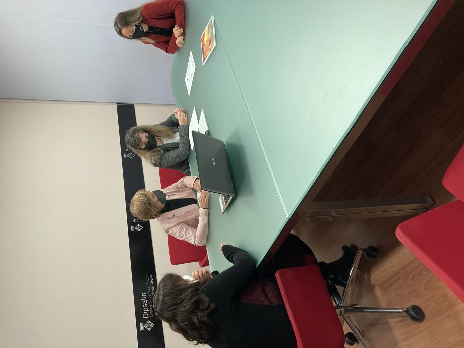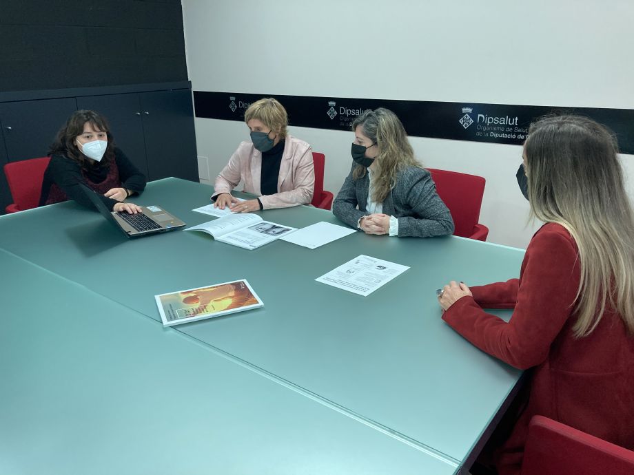 NOTA: Adjuntem fotografies d'una reunió de treball sobre la implementació del programa (celebrada a la seu de Dipsalut aquest 11 de desembre) entre la presidenta i la gerent de l'Organisme, la diputada d'Acció Social i una de les tècniques encarregades de l'assessorament. Autoria: Dipsalut.