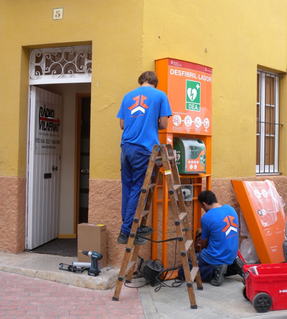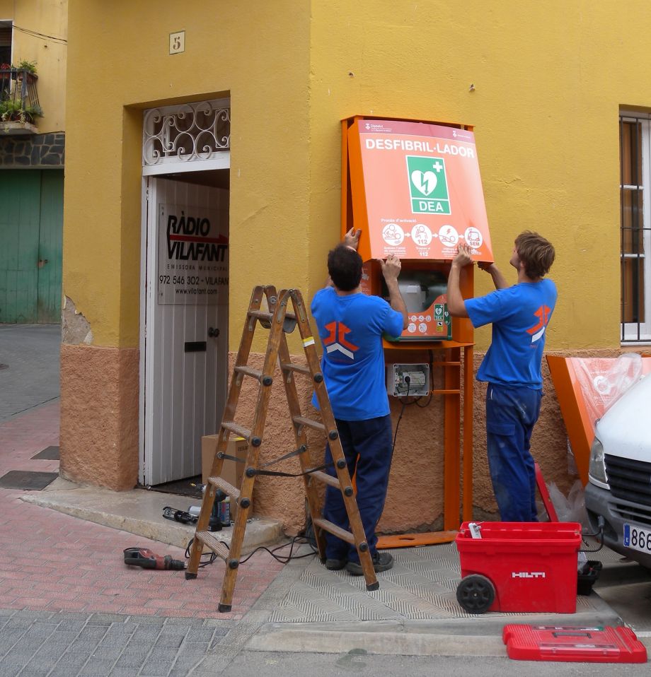 Imatges: Instal·lació d’un dels desfibril·ladors fixos de Vilafant, el del carrer Figueres.