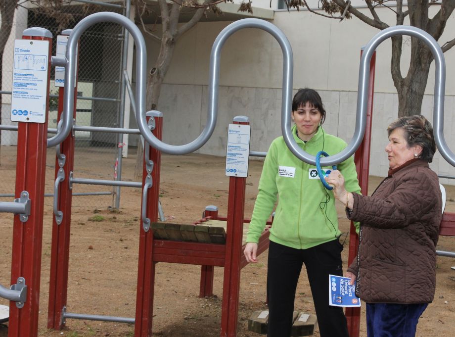 Imatge: una dinamitzadora dels Parcs ensenya a una de les assistents a la sessió d’exercici en grup com cal utilitzar un dels aparells. Font: Joaquim Robert.