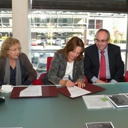 Fotografia (d'esquerra a dreta): Antònia Boix, directora de la Biblioteca de la UdG; Dolors Juvinyà, directora de la Càtedra de Promoció de la Salut, i Josep Marigó, president de Dipsalut, en el moment de la signatura del conveni de donació.
